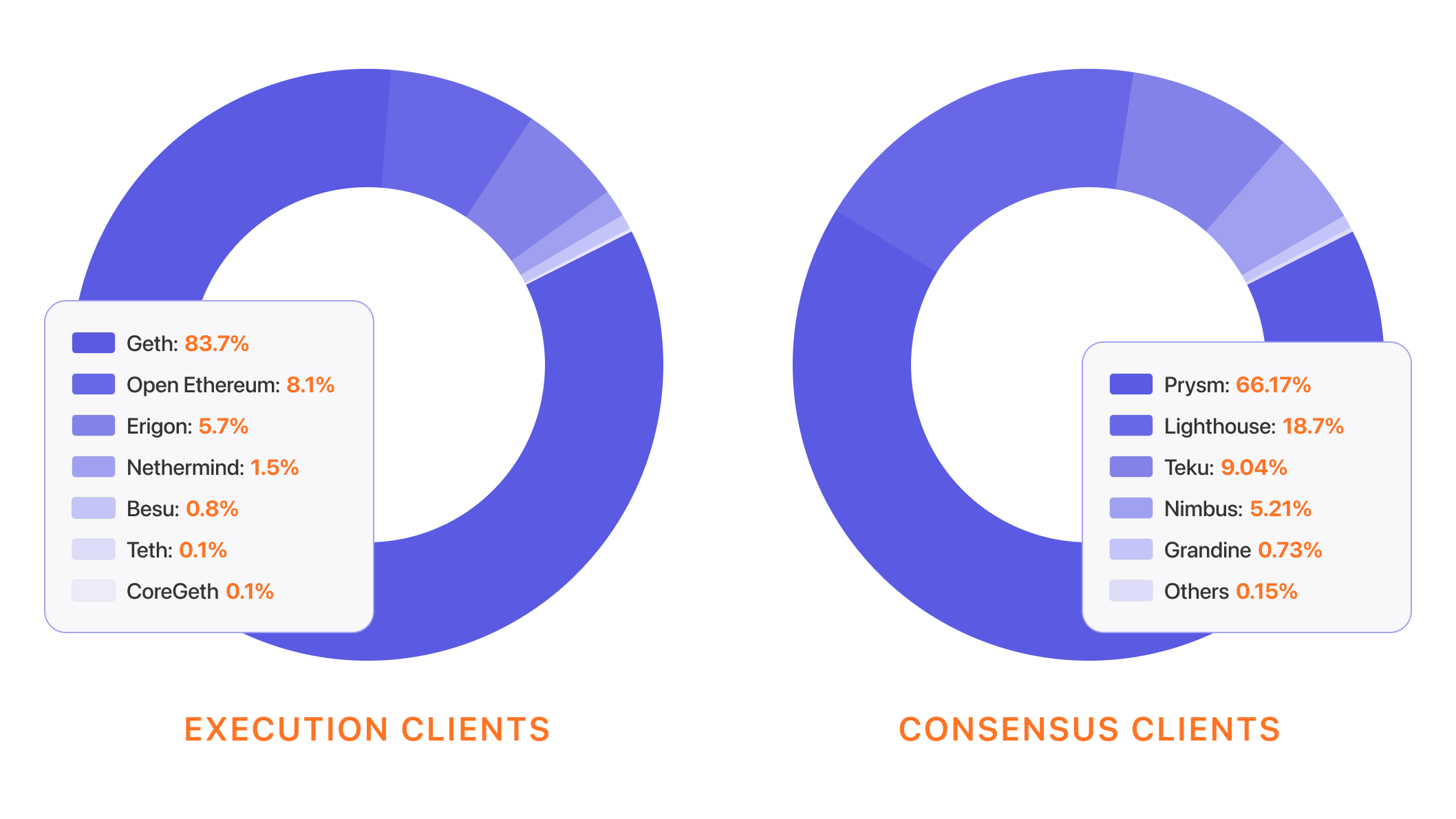 The two pie charts above show snapshots of the current client diversity for the execution and consensus layers (at time of writing in January 2022). The execution layer is overwhelmingly dominated by Gethopens in a new tab, with Open Ethereumopens in a new tab a distant second, Erigonopens in a new tab third and Nethermindopens in a new tab fourth, with other clients comprising less than 1 % of the network. The most commonly used client on the consensus layer - Prysmopens in a new tab - is not as dominant as Geth but still represents over 60% of the network. Lighthouseopens in a new tab and Tekuopens in a new tab make up ~20% and ~14% respectively, and other clients are rarely used.